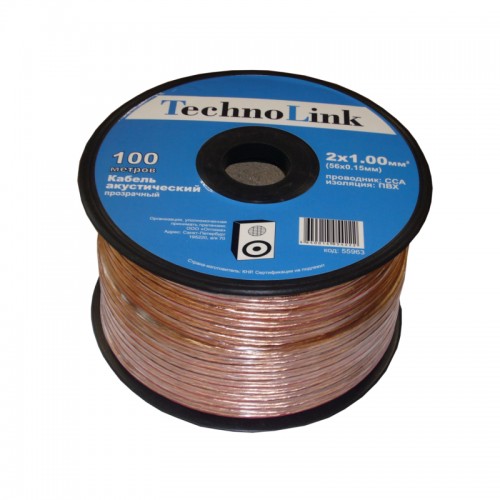 55963 Кабель акустический Technolink 2*1.0мм2 (56*0.15мм) CCA, 100м, пластиковая катушка, прозрачный
