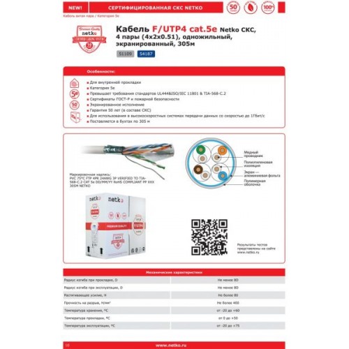 51109 Кабель F/UTP4 (FTP4 ) cat.5e NETKO /4 пары 24 AWG BC / одножильный / экранированный / 305м / серый СКС, FLUKE TEST