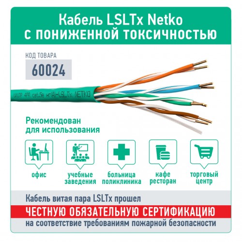 60024 Кабель U/UTP4 cat.5e NETKO /4 пары 24 AWG BC / 305м / нг(А)-LSLTx, зеленый, одножильный СКС, FLUKE TEST