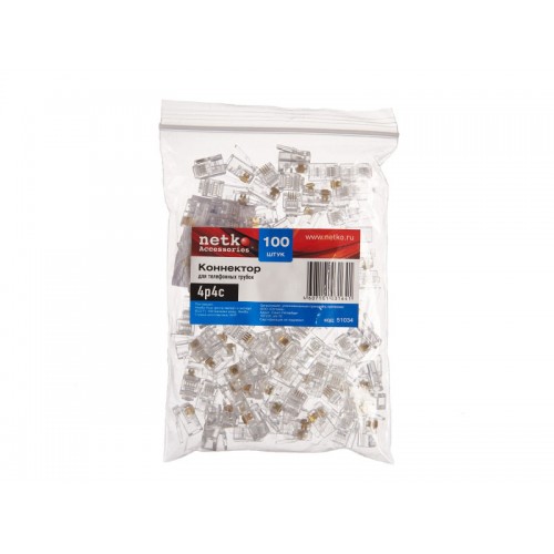 51034 Коннектор RJ-9 Netko (4p4c), для телефонных трубок (нож с 2-мя зубцами), 100шт.