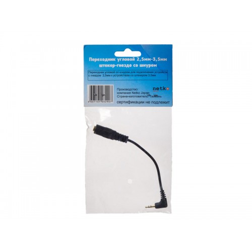 52562 Переходник гнездо 3,5мм стерео - штекер 2,5мм стерео, угловой, шнур 10см, позолоченные контакты, Netko