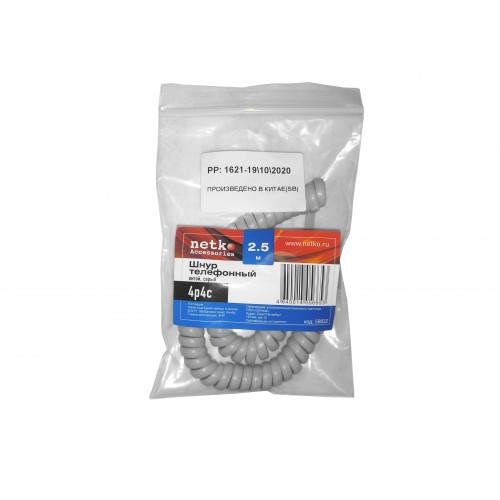 59832 Шнур телефонный витой (4p4c) 2,5 метра / серый, Netko