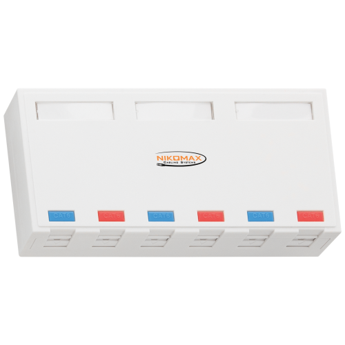 Коммутационные розетки являются составной частью горизонтальных подсистем СКС и предназначены для подключения оконечного оборудования на рабочих местах. Конструктивно розетки могут быть выполнены в двух вариантах: в виде законченного решения с впаянными в печатную плату портами RJ45 и IDC разъемами и в виде пластикового корпуса, в который отдельно устанавливаются коммутационные модули-вставки формата Keystone. Преимущество простых, пустых корпусов состоит в том, что туда могут быть установлены не только модули RJ45, но и любые другие, совместимые с форматом Keystone, в т.ч. телефонные, оптические и коаксиальные, в любой требуемой конфигурации. Корпуса розеток для настенного монтажа NIKOMAX – простое и удобное решение для монтажа сетей. NMC-MB6P-ST-WT - модели 6 портов. Каждый порт данных розеток снабжен индивидуальной шторкой, защищающей контакты от оседания пыли. На корпусах предусмотрены дополнительные выламывающиеся окошки, позволяющие подвести кабели с любой стороны. Для удобства администрирования на всех крышках имеются площадки для маркировки и для установки цветных иконок.