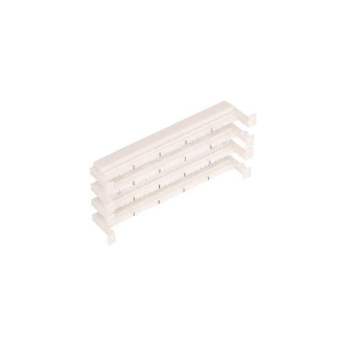 Кроссы 110 типа применяются для разделки на них кабелей различных подсистем СКС. Основным преимуществом 110 кроссов является возможность коммутации каждой отдельно взятой пары, что обеспечивает высокую гибкость переконфигурации кабельной системы. Соединение и коммутация осуществляется при помощи коннекторов 110 типа или соответствующих патч-кордов. Коммутационные блоки обычно монтируются на стену и поставляются в двух конфигурациях: со встроенными установочными пластиковыми ножками и без них. Вариант блоков с ногами обеспечивает более удобное подведение кабеля. Для повышения удобства работы со 110-ми блоками через каждые 5 пар на монтажные пазы нанесены метки. Блоки с ногами также снабжены маркировочными этикетками со съемными прозрачными держателями. Коммутационные блоки NMC-CB110-100L и NMC-CB110-100NL имеют емкость 100 пар. Для заделки 110-х панелей, блоков и коннекторов рекомендуется использовать инструмент NMC-315DR для одновременной заделки нескольких пар (4-х или 5-ти, в зависимости от насадки). Он значительно облегчает и ускоряет работу.
