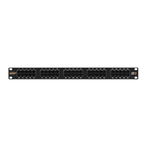 Коммутационные панели (патч-панели) предназначены для монтажа кабелей в различных подсистемах СКС и подключения отдельных составляющих сети друг к другу при помощи коммутационных шнуров. Телефонная патч-панель NIKOMAX NMC-RP50UC3-1U-BK предназначена для монтажа в 19” шкаф или стойку. При стандартной высоте в 1U, панель вмещает 50 портов RJ45/8P6C категории 3, что позволяет значительно сэкономить пространство внутри шкафа. В отличие от большинства телефонных панелей, NMC-RP50UC3-1U-BK поддерживает работу по трем парам, что бывает необходимо для работы некоторых видов цифровых АТС. Для удобства администрирования все порты пронумерованы, а также имеются дополнительные площадки для маркировки. Патч-панель выполнена в классическом черном цвете. Универсальные IDC контакты 110/KRONE расположены с тыльной стороны панели, на горизонтальной подложке. Такая конструкция позволяет гораздо удобнее разводить многопарные кабели. Заделка патч-панели производится по стандарту USOC. Для закрепления кабелей предусмотрен встроенный органайзер.